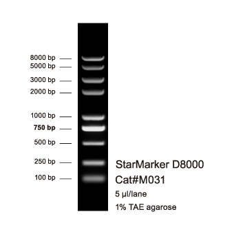 本產(chǎn)品為預(yù)混有 1× 上樣緩沖液的即用型 DNA 分子量標(biāo)準(zhǔn),由 9 條線狀雙鏈 DNA 條帶組成,適用于對 100-8000 bp 的雙鏈 DNA 分子大小的估算和粗略定量。本產(chǎn)品的 9 條帶分別為 100、250、500、750、1000、2000、3000 和 5000 bp、8000 bp。其中 750 bp 條帶濃度最大,為 100 ng/5 µl,其余條帶濃度約為 50 ng/5 µl。